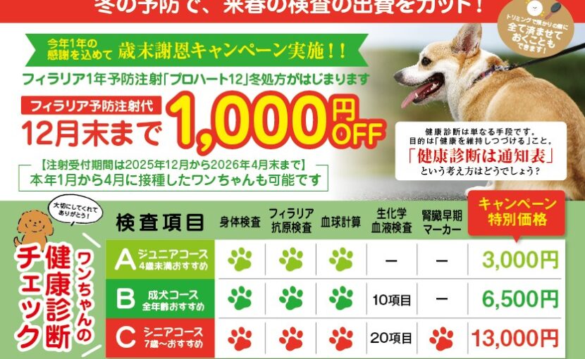12月より、フィラリア1年予防注射『プロハート12』の接種期間が始まりました。