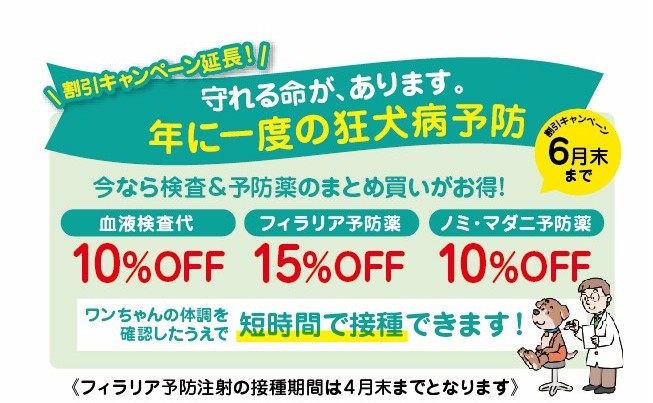 また、ワンちゃんのフィラリア予防注射は今月で接種期間が終了します。